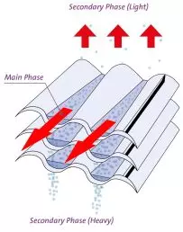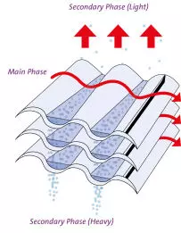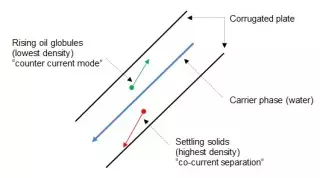 Any break-up of these globules by even slight, local, or general turbulence, will reduce the efficiency of the separator. Consequently, the flow through the unit and in the upstream piping system should be with minimized turbulence. By using corrugated, parallel mounted plates inclined at 45° or 60°, the separator optimises the conditions of short vertical travel under stable streamlined flow and maximum separating surface area. The plates are used in "counter current" mode.