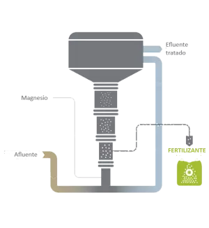 La formación controlada de estruvita se realiza en un reactor de lecho fluidificado de flujo ascendente mediante dos etapas: la nucleación (donde se empiezan a formar las primeras partículas de estruvita) y la deposición (donde se produce la formación de los granos de estruvita en el tamaño deseado).