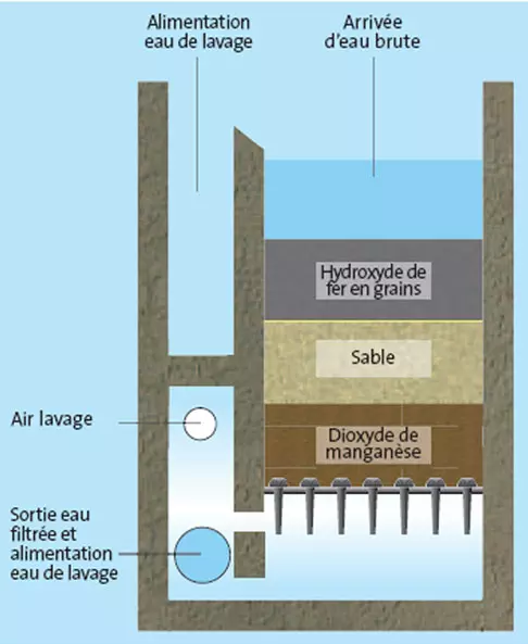 Mangaflo ™ Plus se basa en el mismo princípio con una capa de óxido de hierro para eliminar el arsénico. Este material actúa como adsorbente. Según la capacidad de tratamiento de la instalación, la filtración se realiza con filtro abierto o presurizado.
