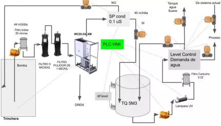 El agua del proceso es colectada en la trinchera con un switch de nivel, esa agua es bombeada para pasar por un filtro bolsa de 10 micras, filtro cartucho de 5 micras y un filtro cartucho de 1 micra, por último el agua se alimenta al equipo Wapol, en la trayectoria se mide diferencial de presión en los filtros cartucho y conductividad de agua, el agua producto pasa por un sensor de conductividad para determinar su calidad, si cumple se manda al tanque de agua producto en caso contrario se regresa a la trinchera, el agua producto se almacena en tanque de 3000 litros y se mantiene en recirculación hasta llenar el tanque, cuando este se llena el agua se enviará de regreso al proceso, en el caso de que el proceso no demande agua esta será enviada al tanque de agua suavizador.