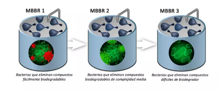 La tecnología MBBR está basada en el crecimiento de biomasa (en forma de biopelícula) en unos soportes plásticos que están retenidos y en continuo movimiento en el reactor biológico. Esta tecnología permite el crecimiento de la biomasa con tiempos de retención mayores a los de los sistemas convencionales, lo que permite el desarrollo de microorganismos de crecimiento más lento, capaces de eliminar aquellos compuestos difícilmente degradables y tóxicos.