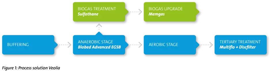 O processo consiste em várias etapas. A primeira fase é a fase anaeróbica. Após o tratamento das águas residuais no sistema Biobed® onde é produzido o biogás. O biogás é então atualizado para os padrões de gás natural via Sulfothane™ (para remoção de sulfeto de hidrogênio (H2S)) e Memgas™ (para atualização de biogás) e injetado na rede de gás. O efluente é posteriormente tratado na etapa de tratamento aeróbico, seguido de tratamento terciário, incluindo filtros de disco Multiflo™ e Hydrotech™ para garantir altos padrões de qualidade.