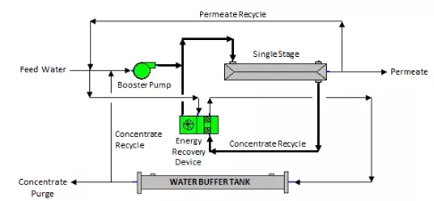 O uso do dispositivo de recuperação de energia como opcional pode fornecer pressão para alcançar o fluxo de permeado à medida que a pressão osmótica aumenta, o que proporcionará uma redução significativa no consumo de energia em comparação com um sistema de osmose reversa convencional.