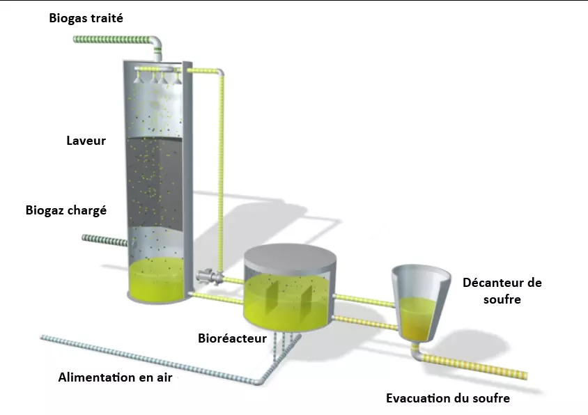 Antes que o biogás seja usado, é essencial remover os compostos de enxofre, presentes principalmente no biogás como sulfeto (H2S). O enxofre pode causar corrosão severa em caldeiras e motores que utilizam biogás. O enxofre é um nutriente essencial para os organismos vivos e é encontrado, por exemplo, nas proteínas. Durante a produção de biogás, o enxofre é convertido biologicamente em H2S. Felizmente, processos biológicos também podem ser usados para remover o H2S do biogás.